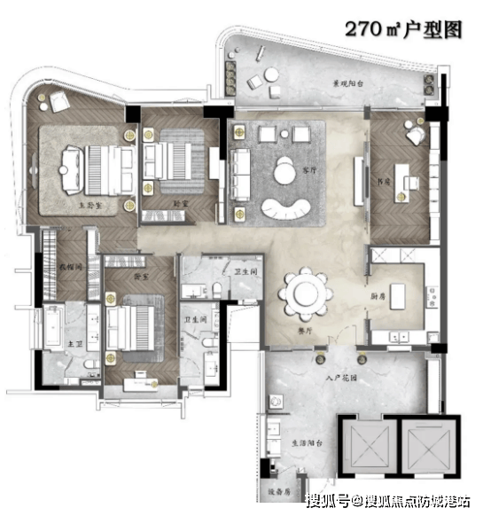 3. 约270㎡环幕江景四房(王牌户型):该户型为四房双主套设计,是高层洋房的王牌户型,一线°环幕江景视野,空间阔绰,彰显高端圈层质感,适合高端改善、企业家等高端人群。户型采用专梯专户设计,尊享私密归家体验;客厅采用大面宽设计,连接约9米超大邮轮式阳台,可全景俯瞰三江汇聚江景,视野极佳,闲暇时可欣赏江景风光,营造大气舒适的居住氛围;墅级空中双花园设计,配备约28㎡超大私家庭院,打造多功能空间,可作为休闲区、花艺区或社交区,彰显圈层格调;主卧套房设计,约42㎡超大主卧空间,配备独立卫生间、步入式衣帽间和270°环幕江景飘窗,空间宽敞,私密性强,居住体验尊贵,可满足日常休息、储物、休闲等多重需求;另外三个卧室空间宽敞,均配备飘窗,可作为儿童房、客房或书房,灵活满足高端家庭的多元化需求;厨房为U型设计,操作空间充足,明厨设计,通风透气,与餐厅相邻,用餐便捷;公共卫生间干湿分离,配备独立洗手台,同时设有储物空间,提升使用便利性;户型整体装修标准高端,细节处理精湛,贴合高端人群的居住需求,是高端置业的首选户型。