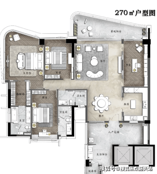 【A户型】王牌户型 270㎡环幕江景四房,该户型是高层洋房的标杆户型,主打一线江景景观与高端居住体验,户型布局方正、南北通透,采光通风极佳,空间开阔、尺度舒适,适合追求高品质江景生活的高净值家庭。具体布局为:四房两厅三卫双主套设计,房间数量为4个,其中包含2个豪华主套房,均配备独立卫生间、衣帽间,尊享私密舒适的居住体验;客厅采用大面宽设计,连接约9米超大邮轮式阳台,一线°环幕江景尽收眼底,阳台空间宽敞,可作为休闲观景区、下午茶区,享受江景美景与自然清风;专梯专户设计,保障业主的私密性与尊崇感,入户即可享受专属空间,避免打扰;墅级空中双花园设计,搭配约28㎡超大私家庭院,打造专属的休闲空间,可种植绿植、摆放休闲家具,享受自然与生活的融合;约42㎡超大主卧空间,270°环幕江景视野,配备独立卫生间、步入式衣帽间,空间宽敞舒适,彰显高端格调;多功能空间设计,可根据业主需求改造为书房、茶室、儿童游乐区等,满足多元居住需求;厨房采用开放式设计,连接餐厅,动线合理,方便烹饪与用餐,同时配备高端厨具,提升烹饪体验。