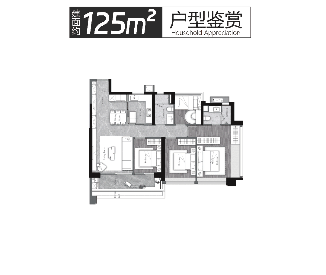 2. 建面约125㎡户型:3房+2厅2卫+灵动空间,该户型为全明设计,4开间朝南,实测南向大面宽约12.8米,采光视野极佳,每一个房间都能享受充足的阳光,通风效果出色。户型布局舒展,空间开阔,IMAX大方厅设计,提升了客厅的空间感和舒适度,适合家人休闲娱乐或接待客人;LDK一体化设计,打通客厅、餐厅、厨房,实现空间的无缝衔接,提升空间利用率,同时方便家人日常互动;全屋配备科学收纳系统,预留了充足的收纳空间,兼顾实用性与美观度,实用率高。灵动空间可灵活改造,根据家庭需求打造书房、儿童房或储物间,适配不同家庭的居住需求,整体户型设计适合中高端改善家庭,兼顾舒适度与实用性。