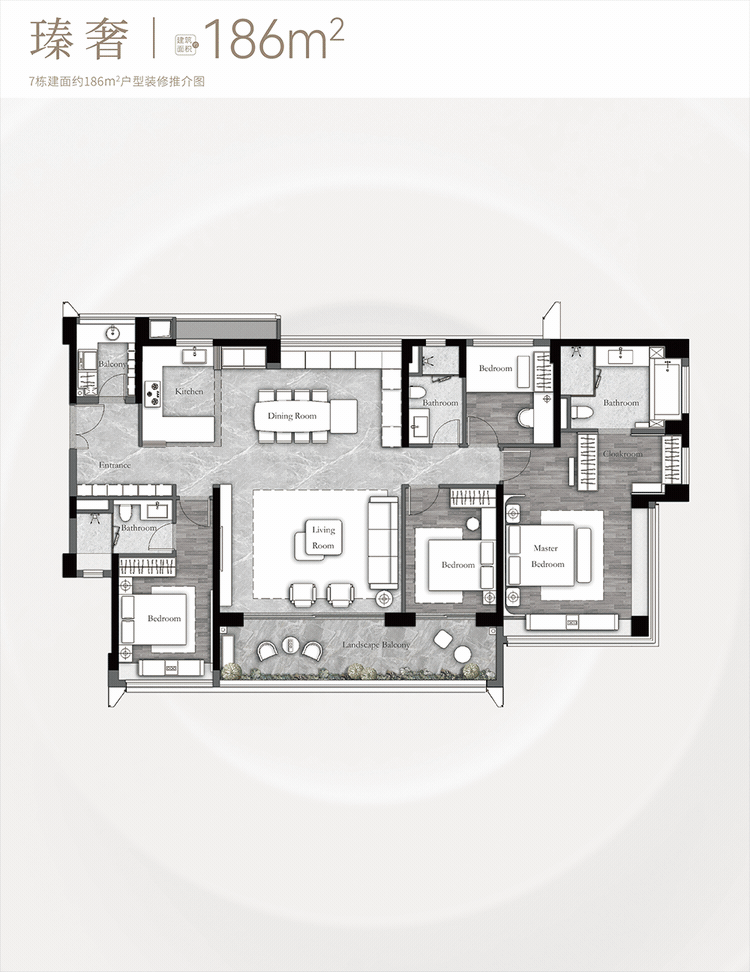 4. 建面约186㎡户型:4房+2厅3卫+灵动空间,该户型为正南向设计,其中01、02户型可享受一线花地湾河涌景观视野,景观优势突出,是项目的高端旗舰户型。户型为全明四开间朝南,实测极致奢幕视野约18.3米,采光充足,通风效果极佳,每一个房间都能享受充足的阳光和开阔的视野。户型采用LDKB洄游路线设计,打通客厅、餐厅、厨房、阳台,实现空间的无缝衔接,提升空间利用率,同时打造了超80㎡多功能巨幕宽厅,空间开阔大气,适合家人休闲娱乐或接待贵宾;多功能岛台灵活使用,可作为早餐台、操作台或社交空间,提升生活便捷度;精致展示柜完美收纳,满足业主的收纳需求,同时提升空间美观度。主卧为超40㎡端厅套房设计,配备独立卫生间、衣帽间和景观阳台,享受酒店总统套房般的居住体验,保障业主的私密性和舒适度;灵动空间可灵活改造,打造书房、茶室、儿童游乐区等,满足家庭多元化的居住需求。