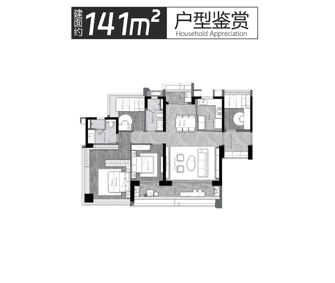 3. 建面约141㎡户型:3房+2厅2卫+灵动空间,该户型为全明设计,多开间朝南,实测IMAX采光视野约14.6米,采光充足,通风效果极佳,让室内每一个角落都能享受阳光与清风。户型最大的特色是拥有约8.2米景观大阳台,阳台视野开阔,可尽揽滨水美景,日常可作为休闲区、晾晒区,或打造小型花园,满足业主的休闲需求;主卧采用端厅设计,270°全景采光,视野极佳,可欣赏滨水景观,提升居住舒适度,主卧配备独立卫生间和衣帽间,保障业主的私密性,打造专属的私密空间。户型布局合理,空间舒展,LDK一体化设计,提升空间利用率,灵动空间可灵活改造,满足家庭多元化需求,整体设计高端大气,适合高端改善家庭,兼顾舒适度与私密性。